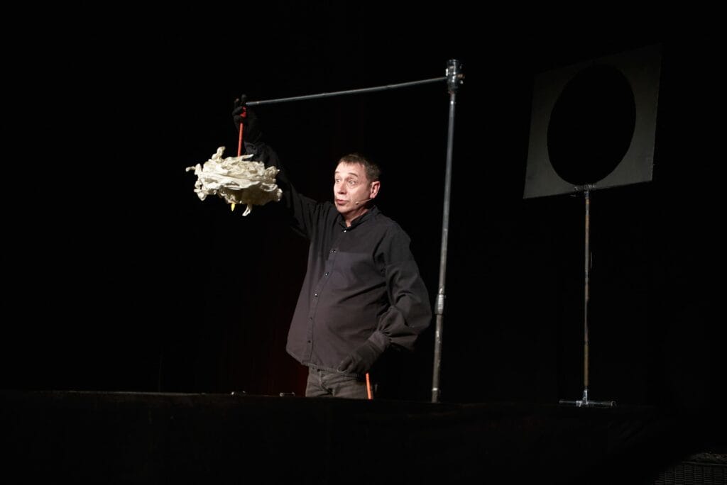 El espectáculo que ha cerrado la segunda jornada del festival de IMAGINARIA con una gran acogida de público ha sido “Entre diluvios” de La Chana Teatro (Castilla y León). Una obra una adaptación muy libre de cuatro episodios de la Biblia. “Entre Diluvios” es una exhibición magistral de monólogo, narración oral y teatro de objetos. El manipulador-narrador plantea un origen del mundo disparatado, en el que la evolución de la sociedad viene marcada por silogismos aparentemente absurdos que llevan a la humanidad a conclusiones lógicamente absurdas. Los aspectos más profundos de la condición humana son tratados con el mayor de los distanciamientos, con una actitud socarrona y ácida.