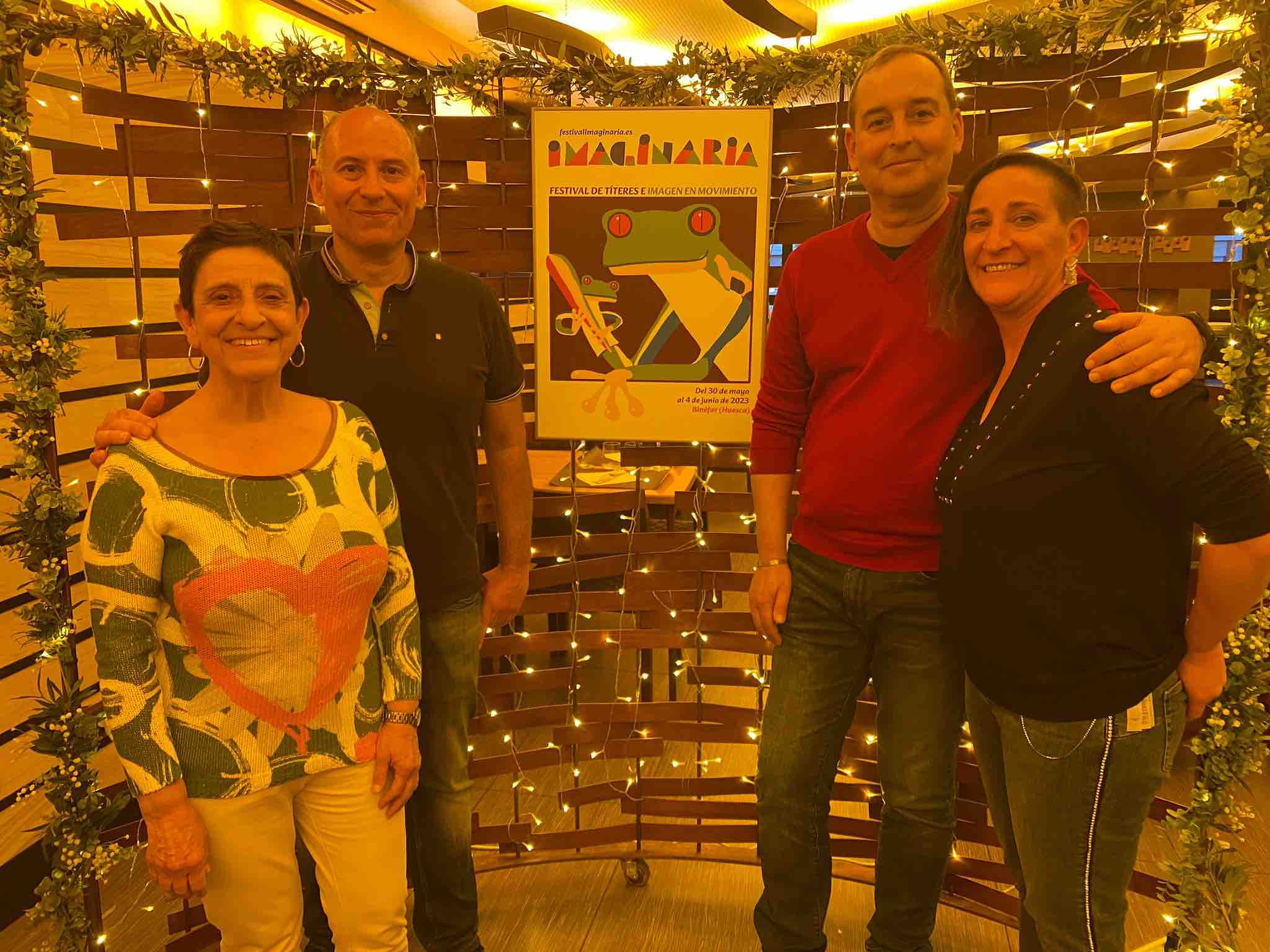 IMAGINARIA, el festival de títeres e imagen en movimiento que se celebra en Binéfar organizado por el Ayuntamiento, inició ayer tarde su cuenta atrás con el tradicional acto de presentación en sociedad del cartel de la presente edición, la décima, ante las empresas y entidades colaboradoras con el certamen, en el restaurante Di Marco. El cartel es obra de un veterano ilustrador aragonés, José Luis Cano (Zaragoza, 1948) que ha rendido homenaje en su trabajo a los tradicionales títeres de cachiporra a la vez que juega con la doble personalidad para reflexionar sobre esta característica humana que tanto le interesa. La icónica rana de IMAGINARIA es la protagonista del cartel. “Es el animal tótem del festival y decidí hacer una rana titiritera con un títere que también es otra rana con un as de bastos en alusión a los títeres de cachiporras que son los más tradicionales. Busqué varios tipos de ranas y encontré una tropical que tenía muchos colores y pensé que le daría mucha más animación al cartel”, cuenta el autor, agradecido por la invitación de Los Titiriteros de Binéfar, directores artísticos del certamen. “Siempre es de agradecer que se acuerden de uno, aunque ya esté jubilado”, comenta.